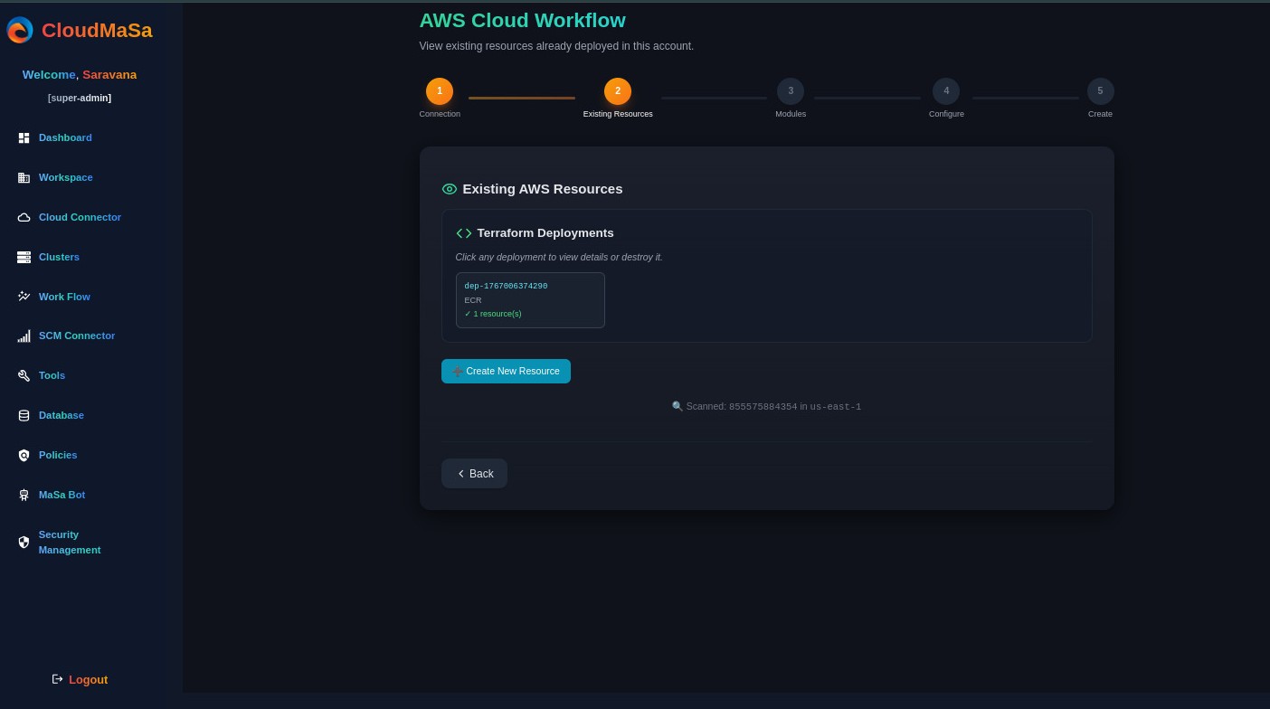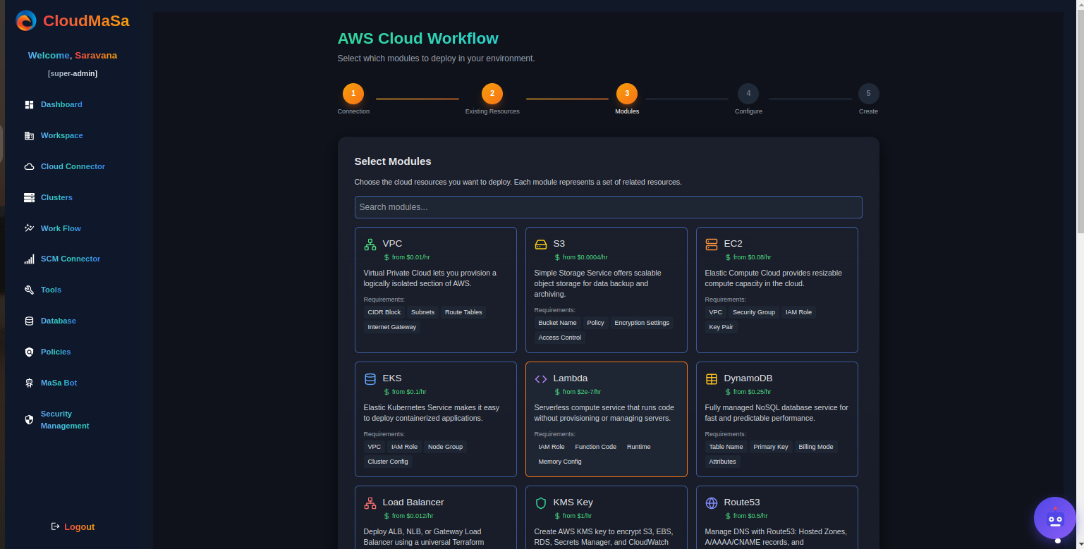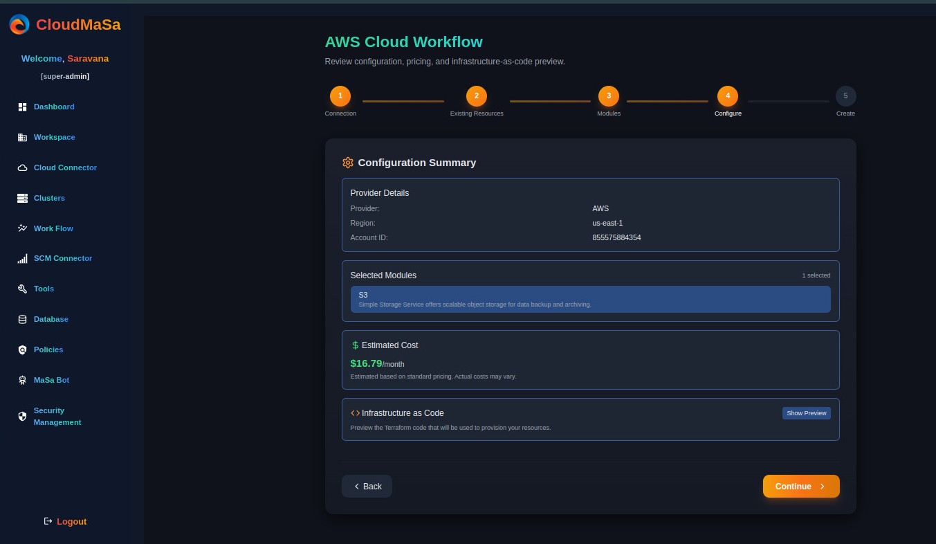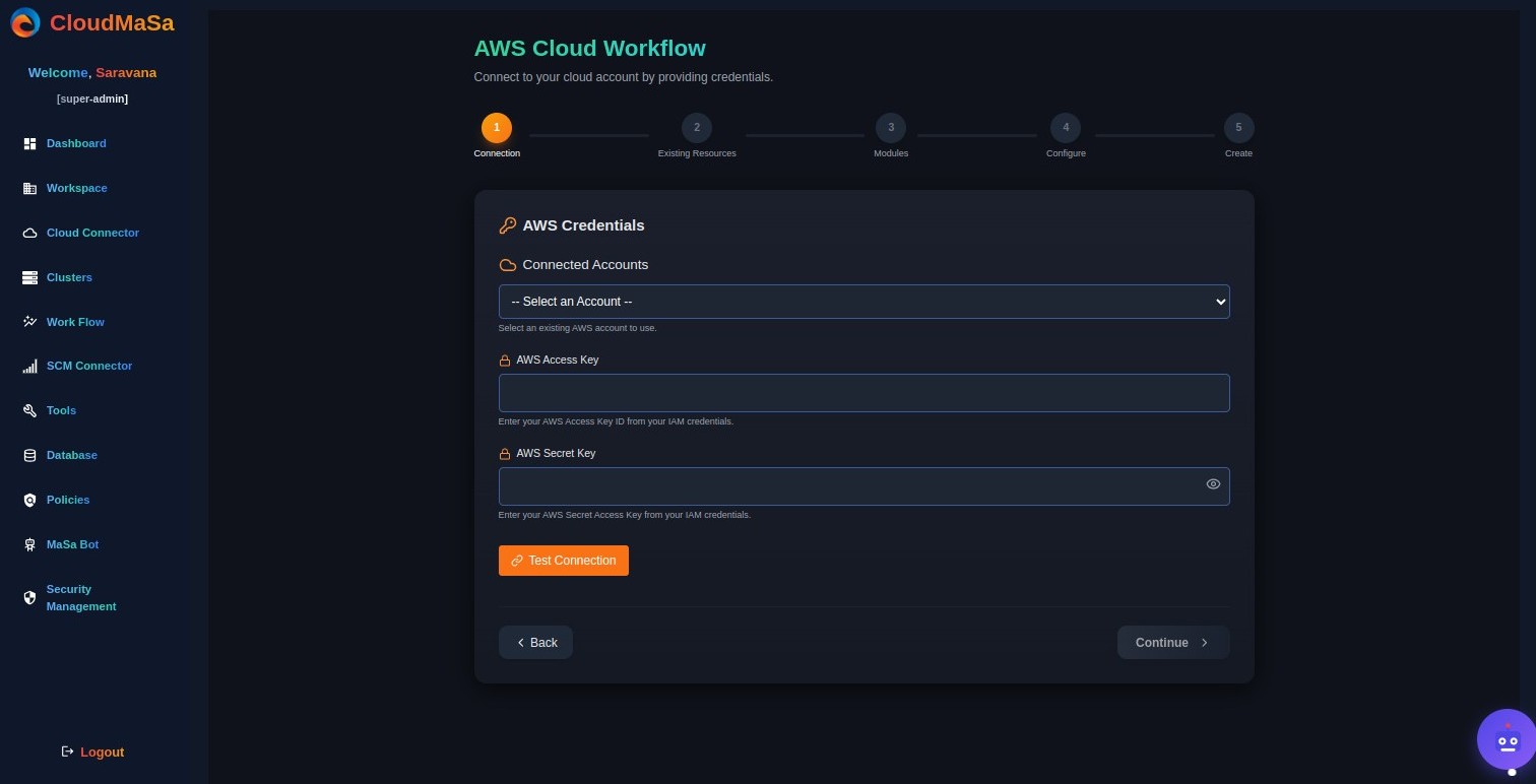 The AWS Cloud Workflow in CloudMaSa walks you through a 5-step process to securely connect, configure, and deploy AWS resources in minutes. Whether you're provisioning an S3 bucket, launching an EKS cluster, or setting up a full CI/CD pipeline, everything is done through an intuitive UI that generates production-ready Infrastructure-as-Code behind the scenes.